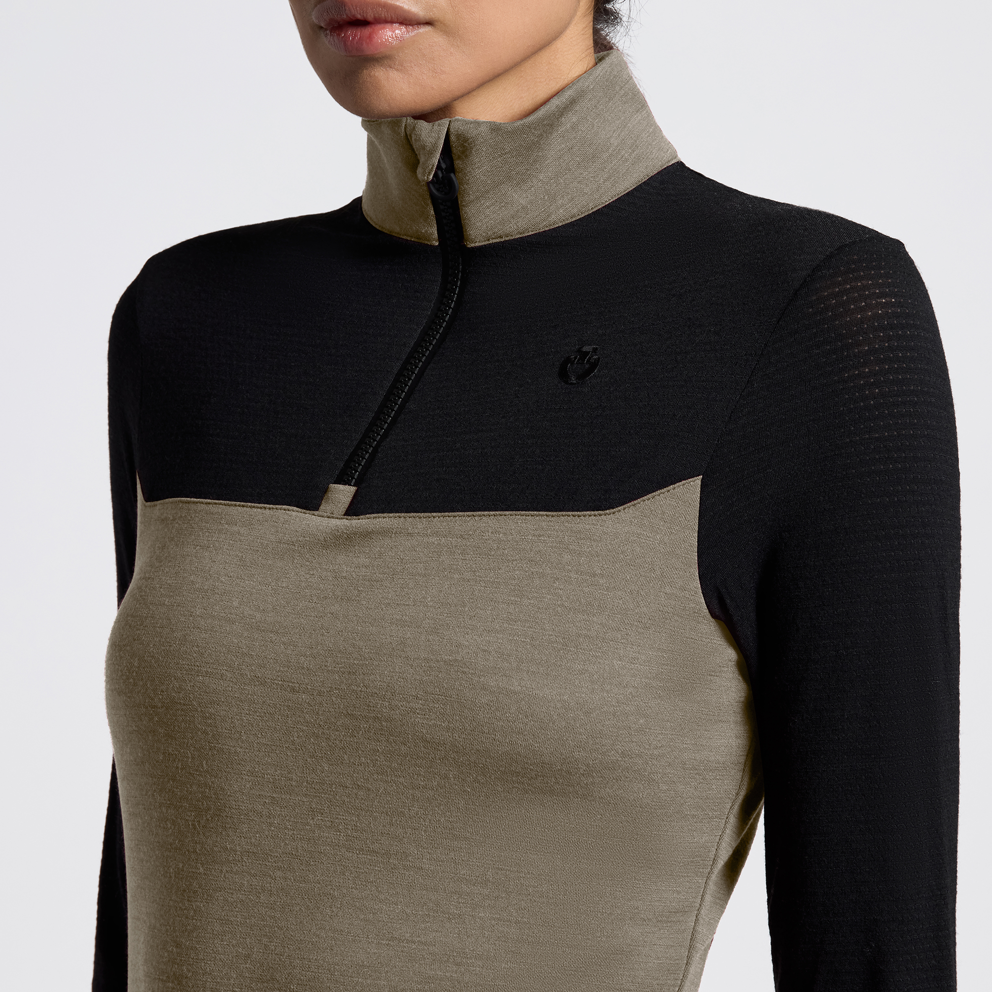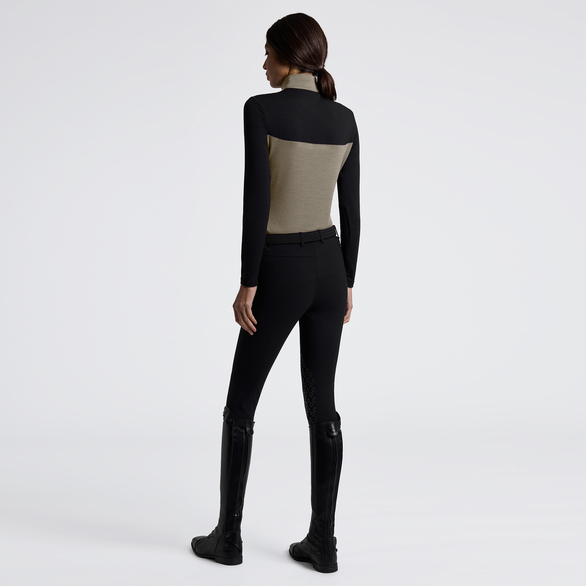 De Cavalleria Toscana damestrainingspolo met lange mouwen en halve rits is gemaakt van technische wol en ontworpen om vrouwelijke ruiters te ondersteunen tijdens sportieve activiteiten op koelere dagen. Het ontwerp is voorzien van waterafstotende, winddichte technische stof op de mouwen en schouders, terwijl de wollen body zorgt voor thermisch comfort en ademend vermogen. De hoge kraag en gepersonaliseerde halve rits verbeteren de bescherming en pasvorm. Afgewerkt met het Cavalleria Toscana-logo, combineert deze polo prestaties, modern design en functionele stijl.