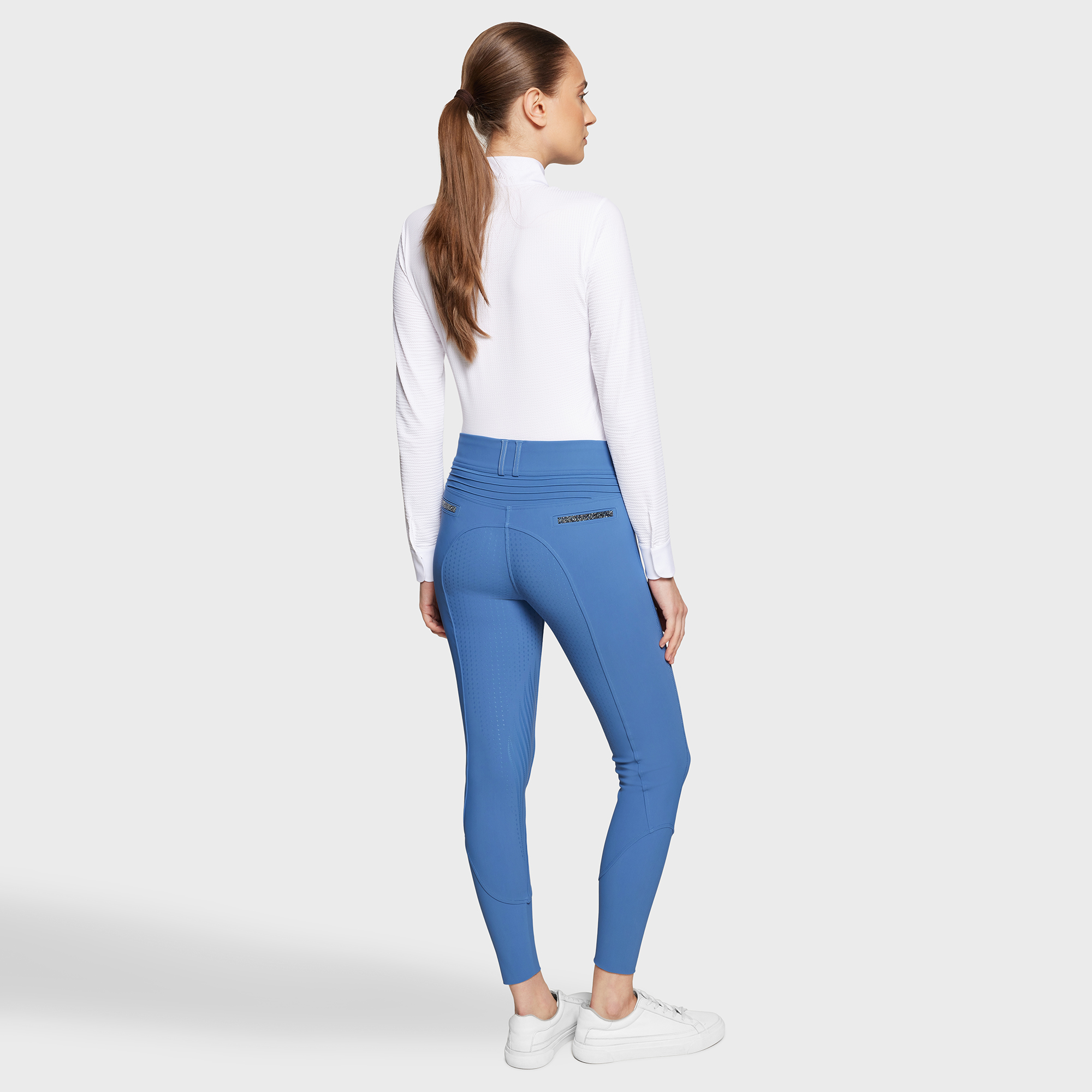 Clara Premium damesrijbroek met hoge taille en grip. Ontworpen voor ruiters die op zoek zijn naar een functionele stijl met prachtige Crystal details.