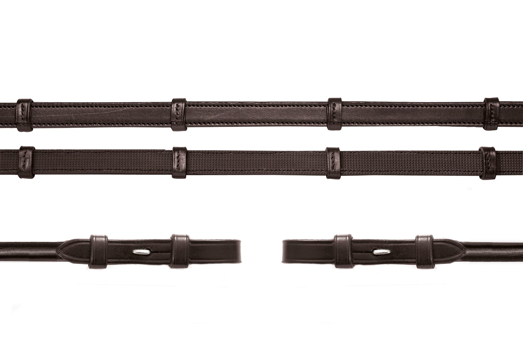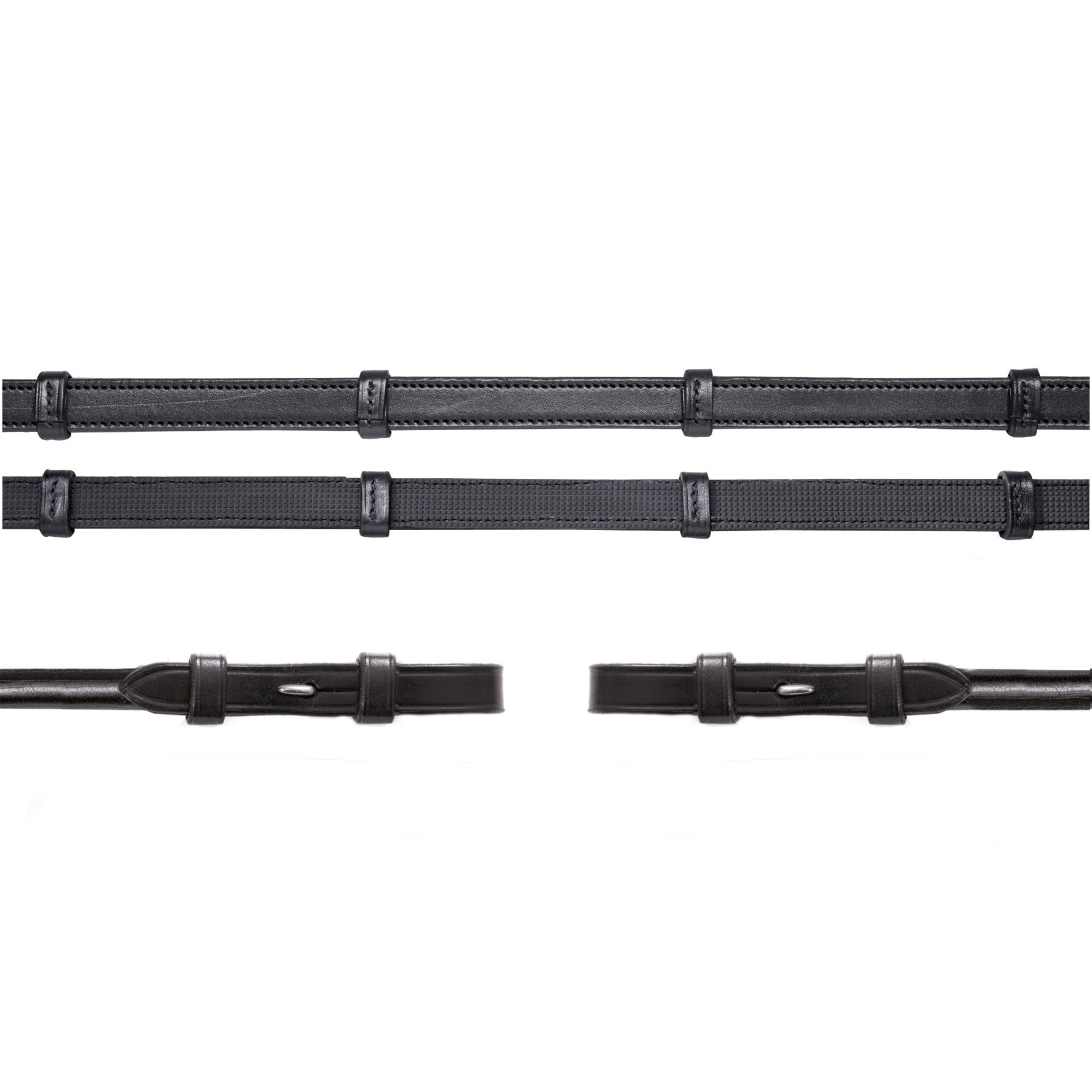 Deze speciale, rondgenaaide teugels met haak- en drukknoopsluiting overtuigen door hun twee verschillende zijden: de bovenzijde van de teugels is gemaakt van glad leder met stops, terwijl de rubberen achterkant zorgt voor een betere grip.